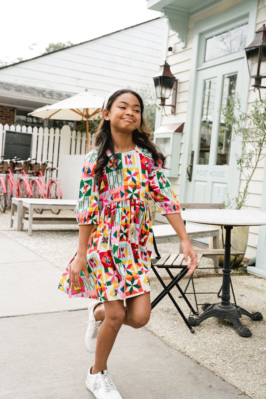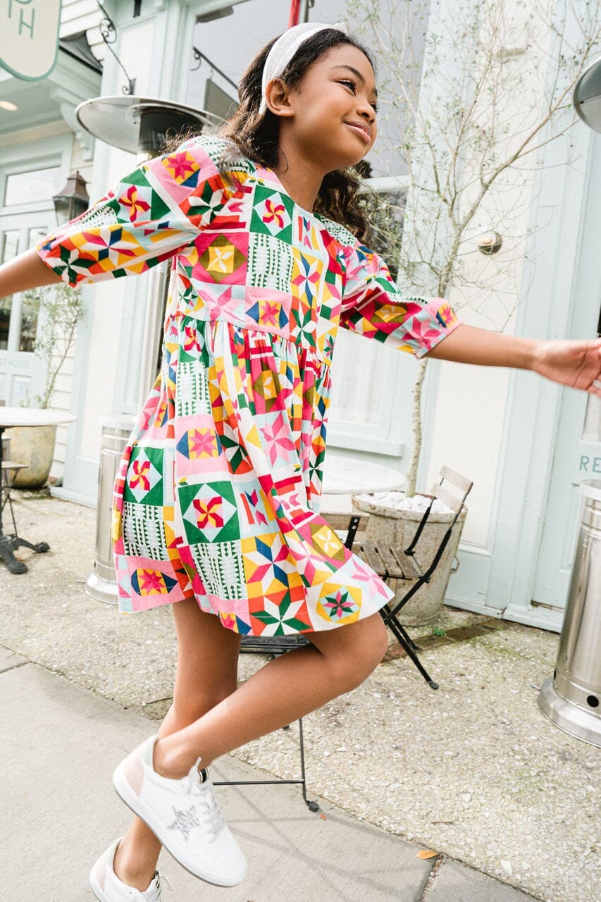 Dress your girl in vibrant style with this soft cotton Naomi Dress. The shift style and vibrant patchwork print make for an eye-catching look, sure to be admired. A beautiful blend of comfort and style.