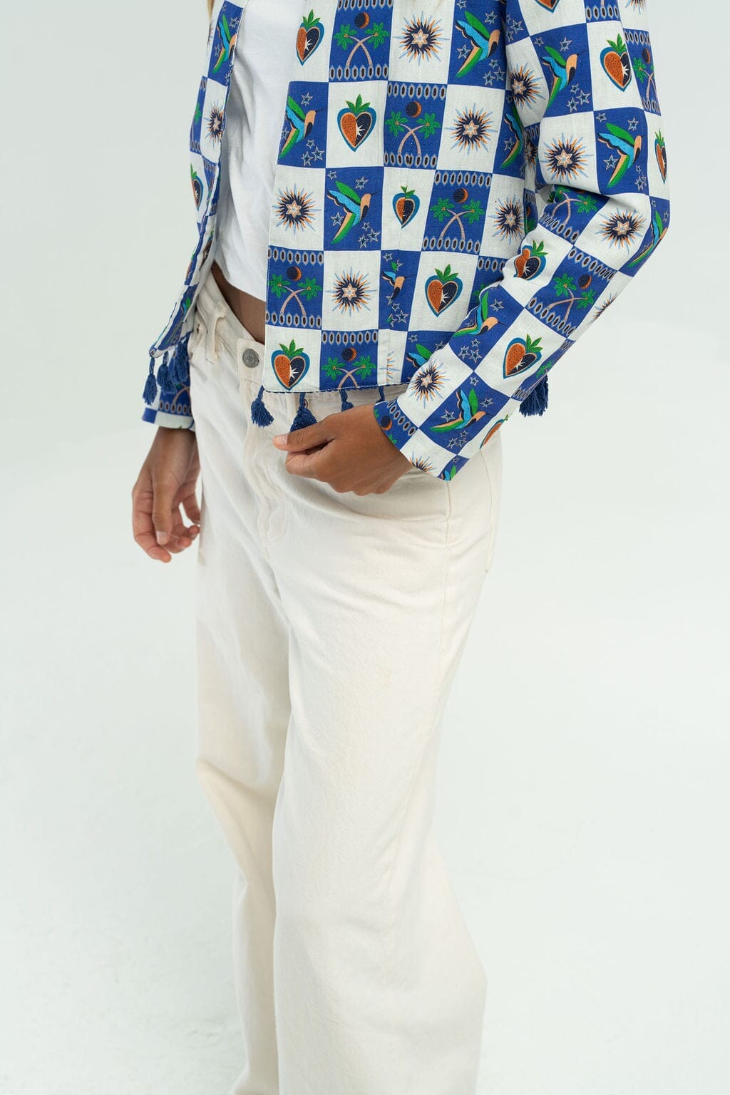 The Phoebe Jacket is your ticket to effortless style with serious personality. Bursting with a bold patchwork print featuring rich cobalt blues, delightful hearts, cheerful suns, and charming decorative elements, this jacket transforms any basic outfit into a showstopper. It's the kind of statement piece that brings instant fun and flair to your wardrobe, making every day feel a little more colorful and a whole lot more you.