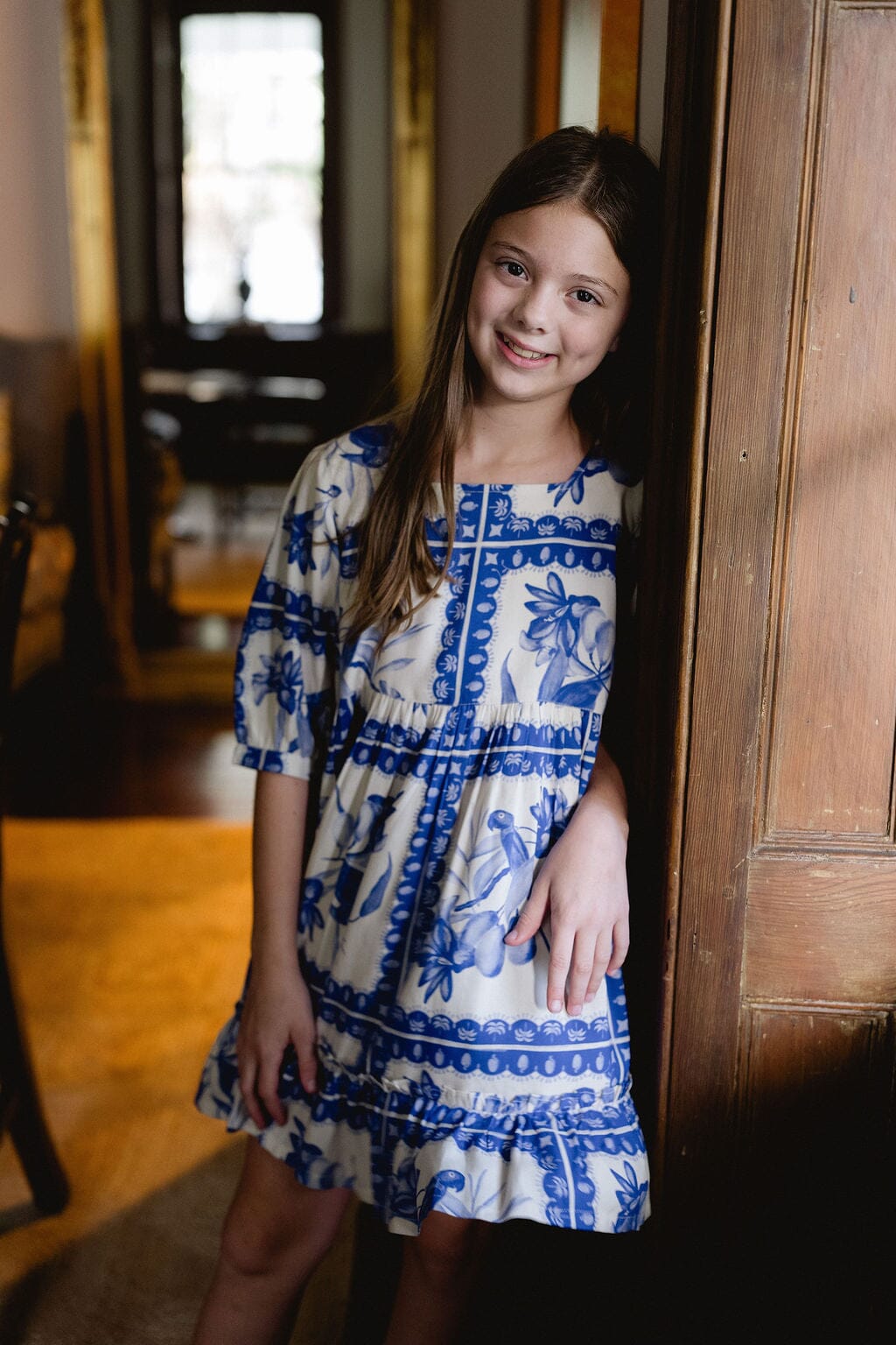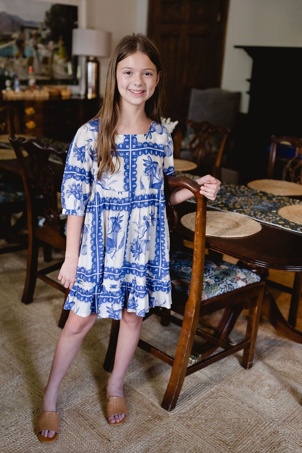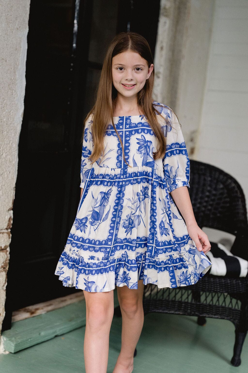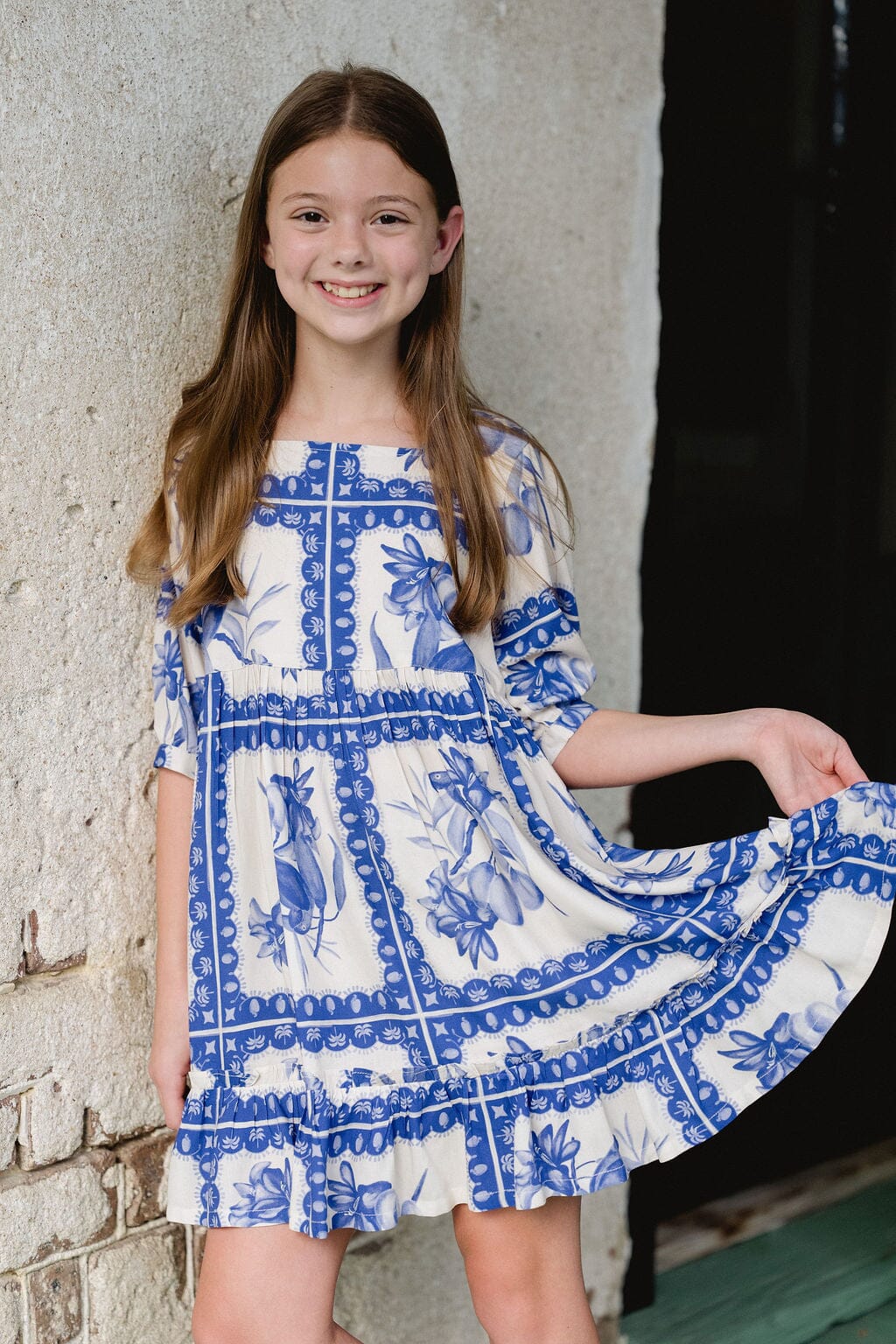 Sweet, timeless, and beautifully detailed — the Kenzie Dress captures classic charm with a modern, playful twist. Featuring a stunning blue-and-ivory tile-inspired print, this dress brings a fresh, elegant look your little one will love for any occasion.