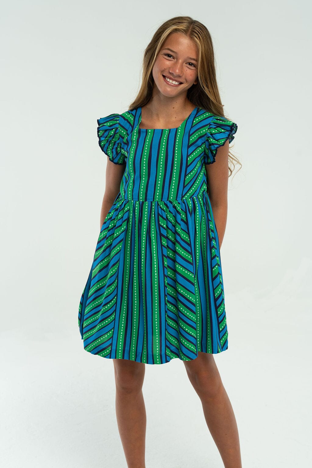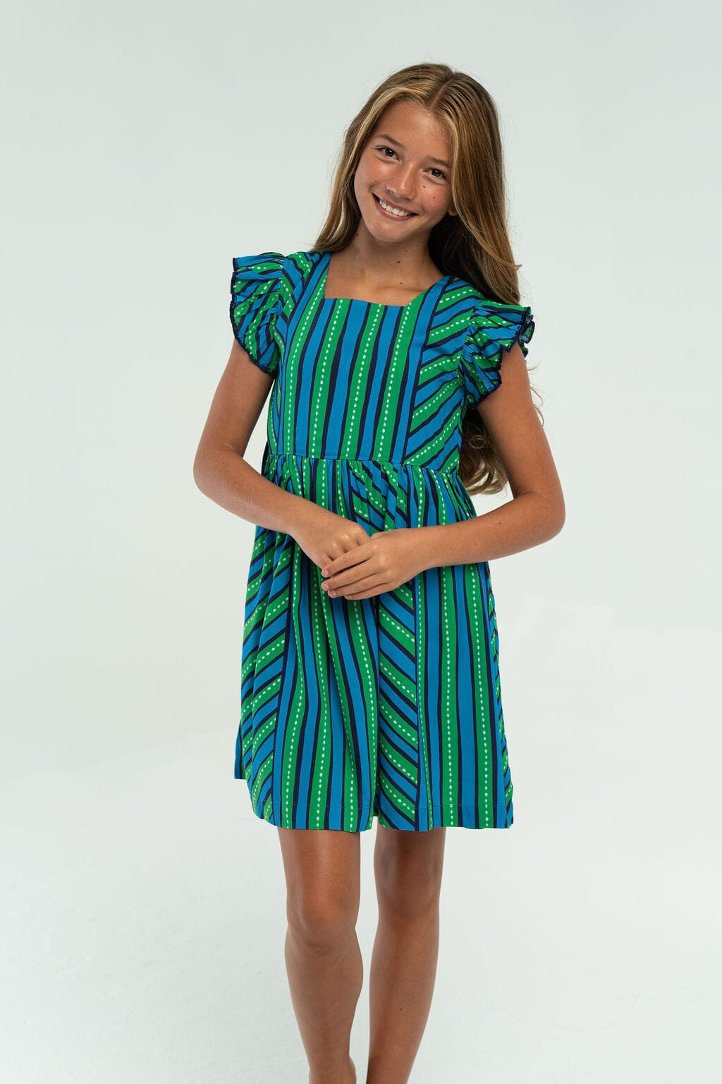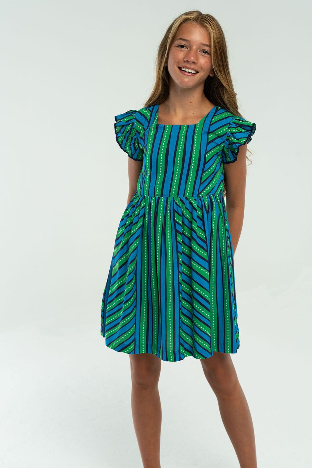 Colorful, cute, and full of personality — the Maya Dress is the perfect blend of playful charm and everyday comfort. Its vibrant stripe pattern in rich blues and greens brings a fun, eye-catching look your little one will love. Whether she's heading to school, playdates, or family gatherings, this dress delivers style that keeps up with her active lifestyle while staying soft and easy to wear all day long.