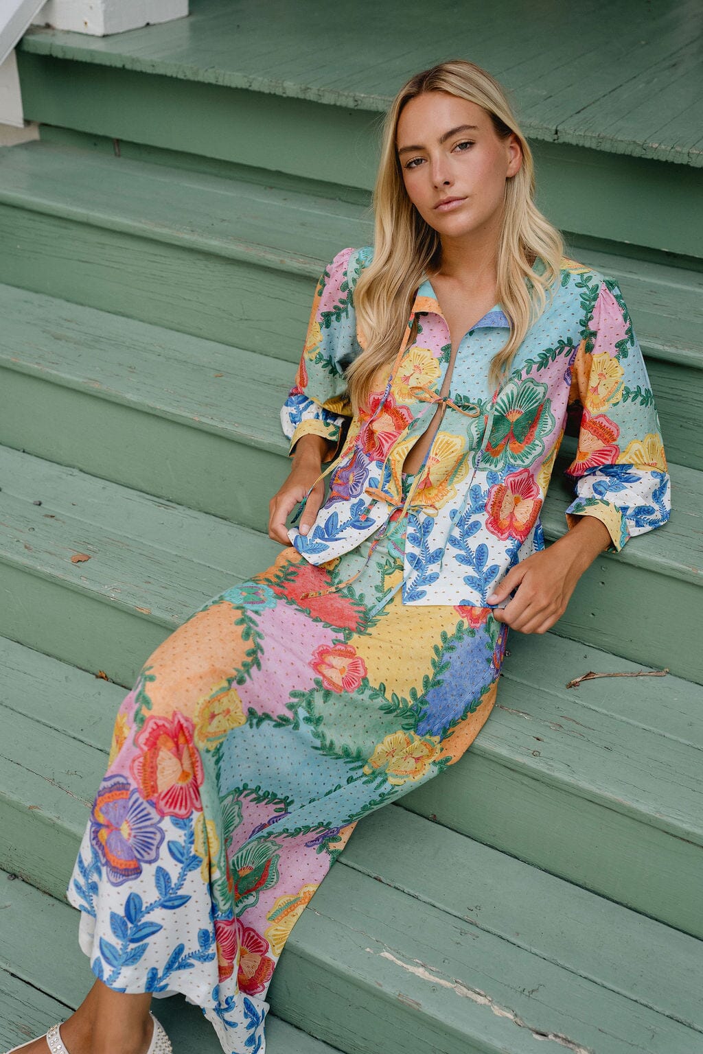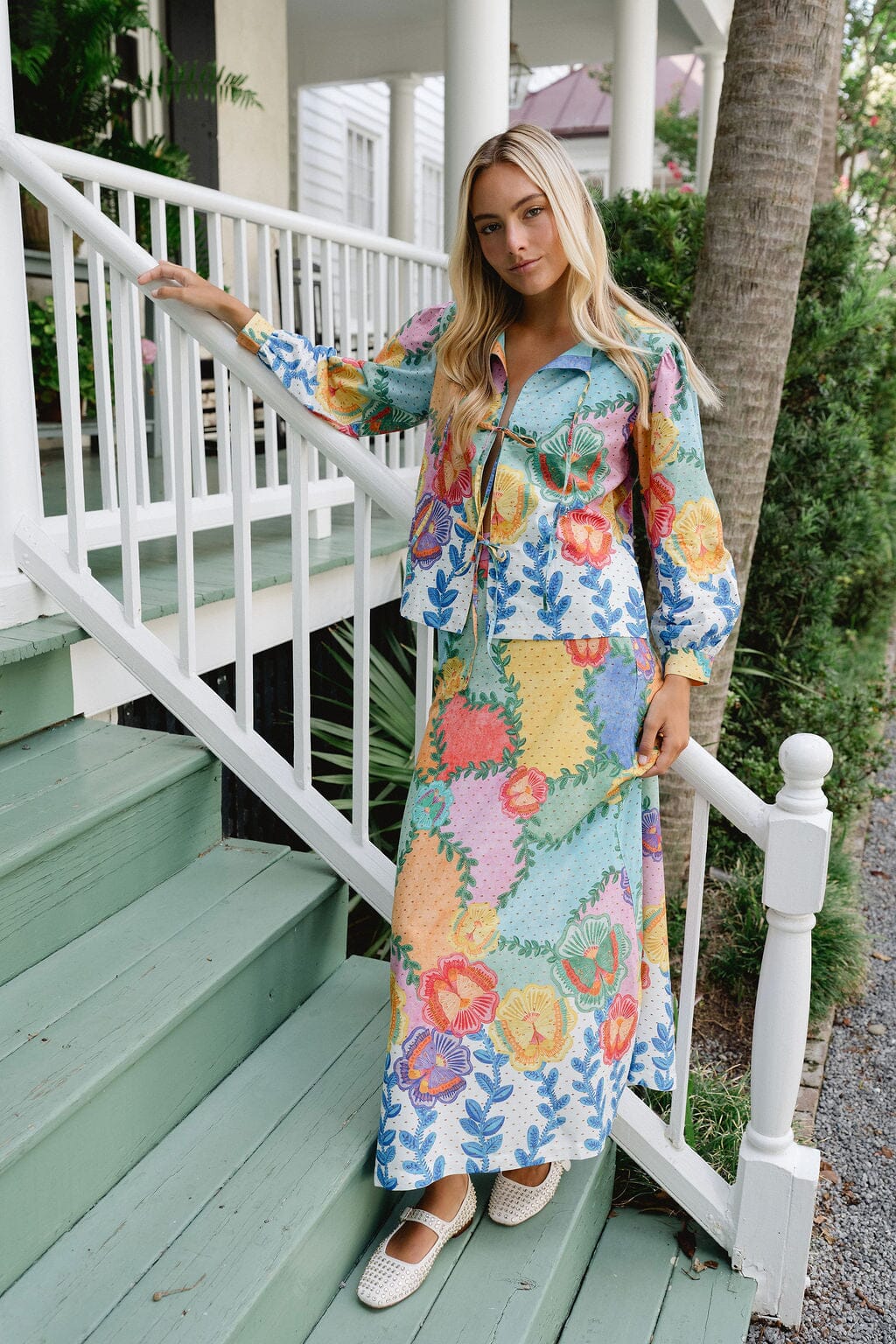 The Tiffany Skirt is a statement-making midi designed to bring color, movement, and effortless charm to your wardrobe. Featuring a beautifully layered patchwork floral print in soft pastels and sun-washed hues, this skirt feels fresh, feminine, and distinctly Briton Court.