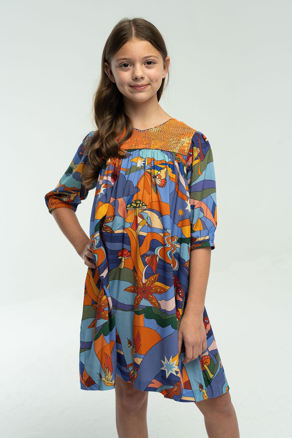 The Alice Sequin Dress sparkles with a dazzling sequin neckline and features a fun, colorful print that’s perfect for parties. Its playful design makes it an exciting choice for celebrations, ensuring your little one shines bright and feels festive all day long.