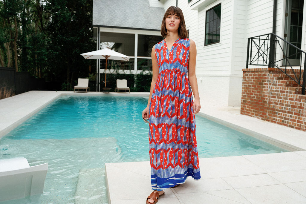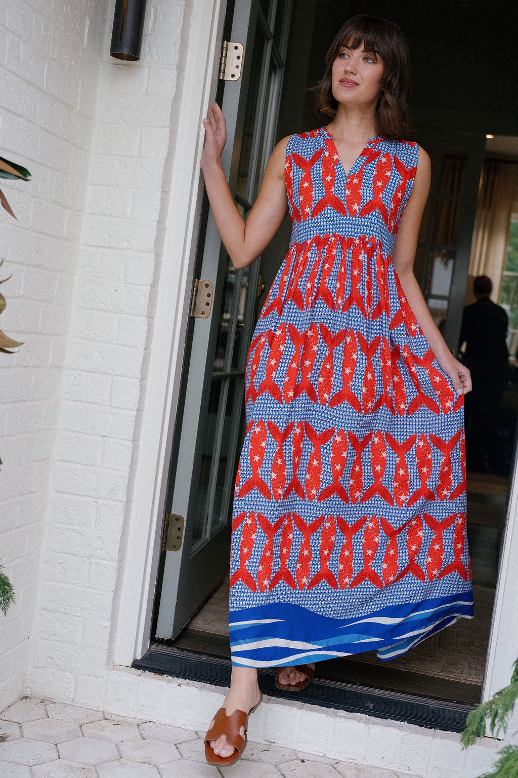 The Jenny Sleeveless Maxi captures the charm of a Nantucket summer with its playful coastal print and easy, breezy silhouette. Crafted from soft, lightweight viscose, this effortless maxi features a flattering sleeveless cut, a split neckline, and a relaxed fit that moves beautifully from day to night.