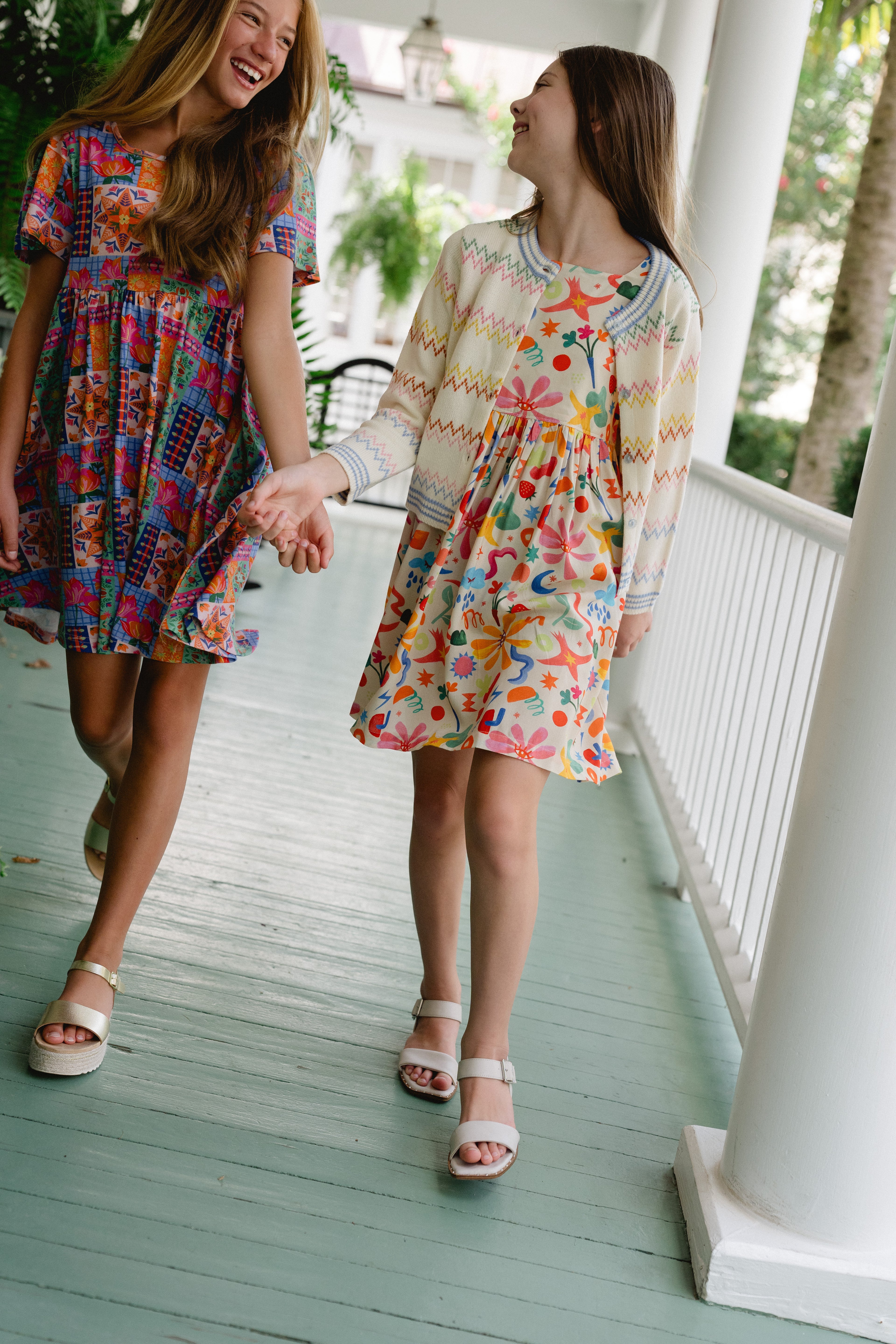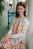 The Evelyn Striped Cardigan is the perfect lightweight layer for polished everyday styling. Crafted in a soft knit with cheerful multi-color zig-stripe detailing, this classic button-front cardigan adds a playful yet timeless touch to any outfit. The cropped silhouette pairs beautifully over dresses or with skirts and denim, making it an easy go-to piece for transitional seasons.