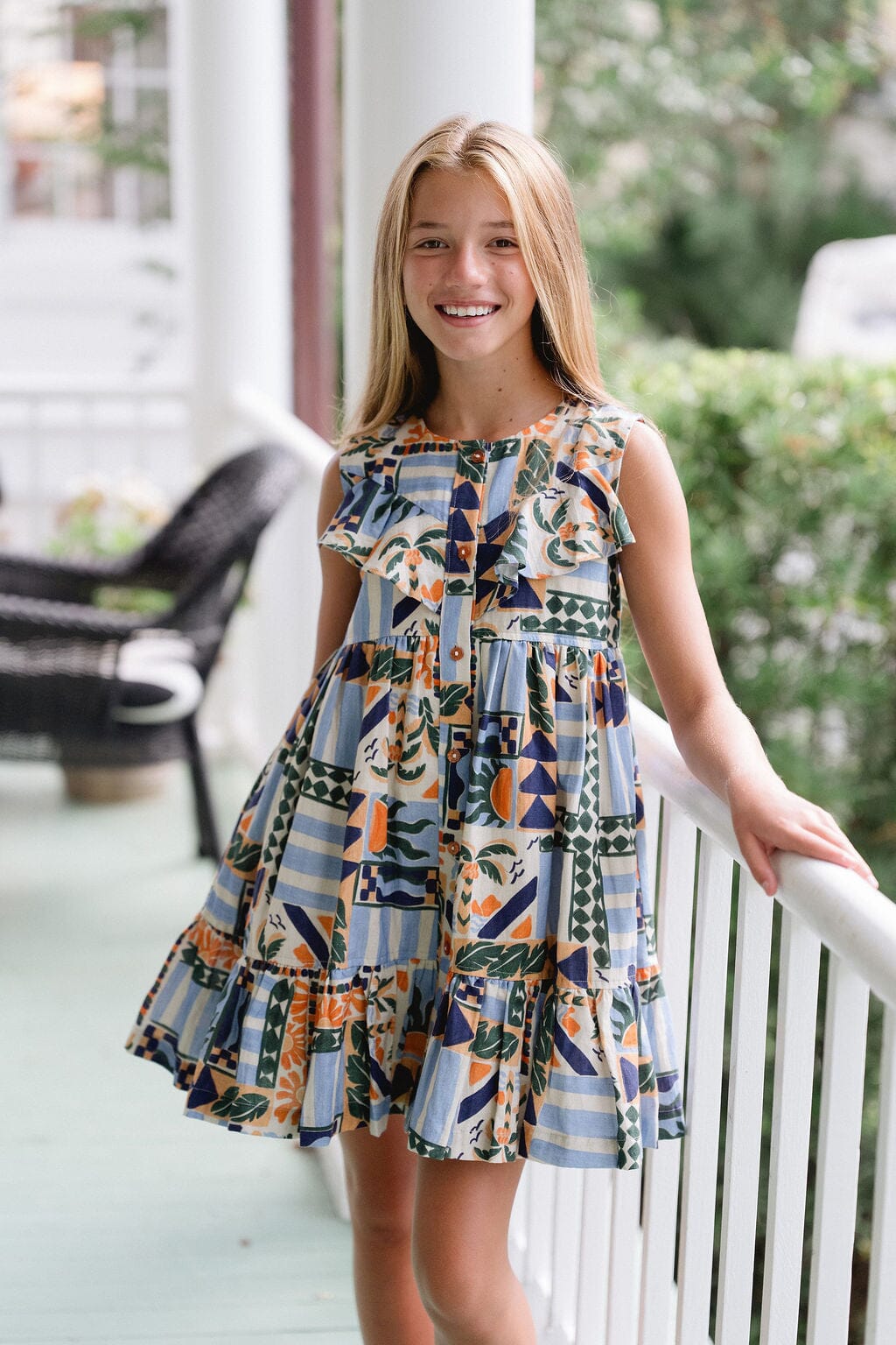 Let your little one shine in the Savannah Dress—a whimsical wardrobe essential bursting with personality. This cheerful frock showcases a delightful patchwork design splashed with golden sunset hues, serene sky blues, and fresh botanical greens. Perfect for spinning, playing, and making memories, it combines carefree style with everyday comfort that keeps up with active adventures.