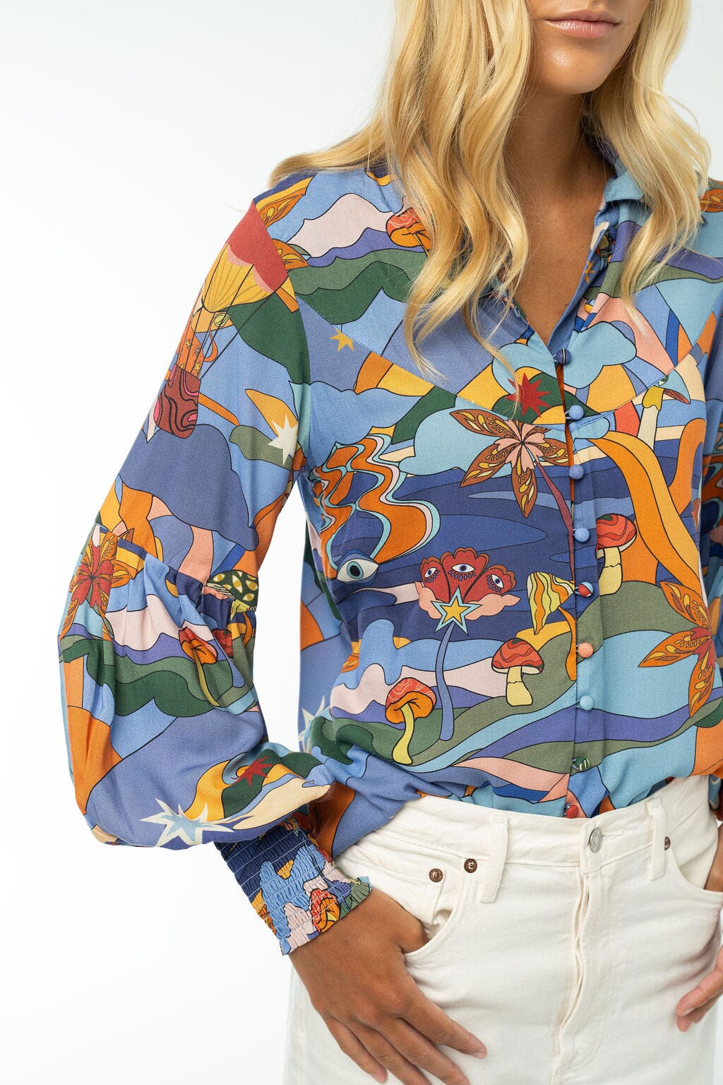 The Samantha Top delights with its billowy sleeves and fun, eye-catching print. Crafted from soft fabric, it offers a comfortable fit that moves with you. Perfect for adding a playful touch to your everyday wardrobe, this top easily pairs with jeans or skirts for a vibrant, relaxed look.